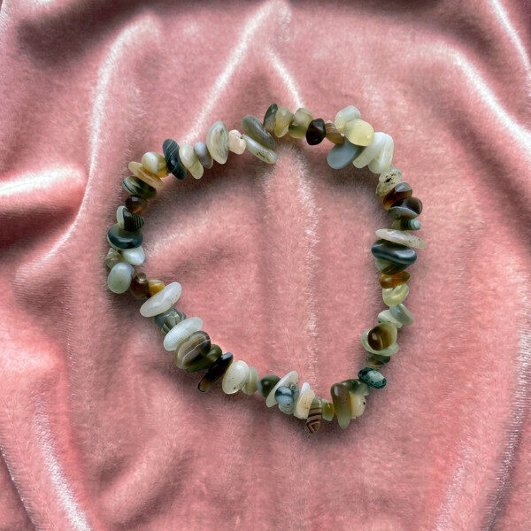 La variedad conocida como ágata de Botswana rosa es una de las más buscadas por su tonalidad cálida. Cada piedra tiene un dibujo irrepetible, lo que la convierte en una pieza única por sí misma. Si quieres llevarla contigo, puedes ver nuestra pulsera chip de ágata de Botswana, elaborada con piedras naturales sin tratar.
