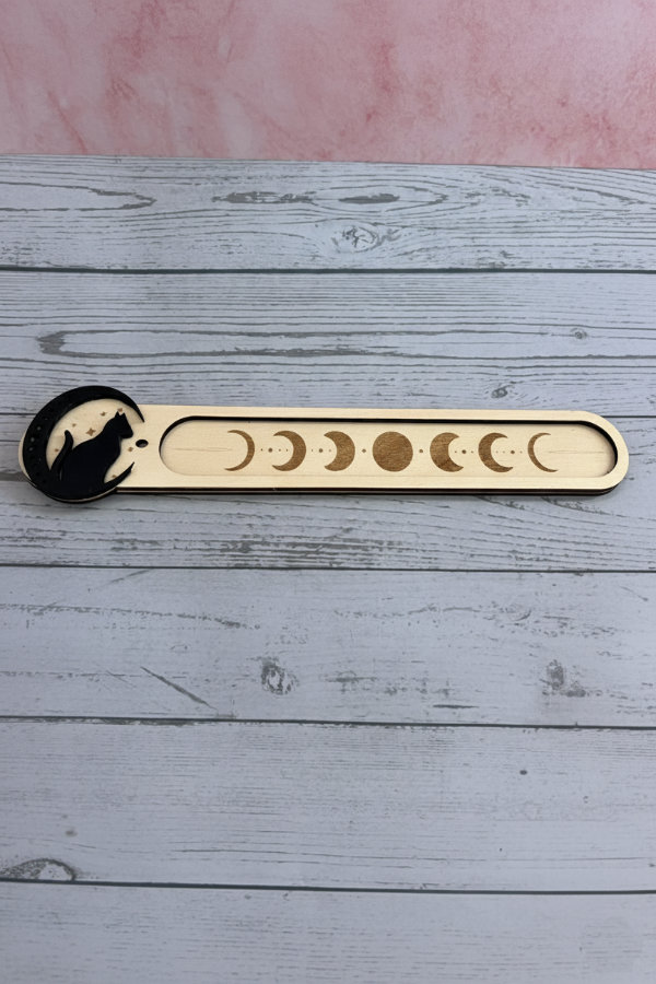 Quemador de incienso artesanal hecho en madera, con un elegante gato negro y un detallado grabado de los ciclos lunares en la base. Una pieza única que aporta misticismo y estilo a tu hogar, ideal para crear ambientes relajantes y combinar con nuestras velas aromáticas.